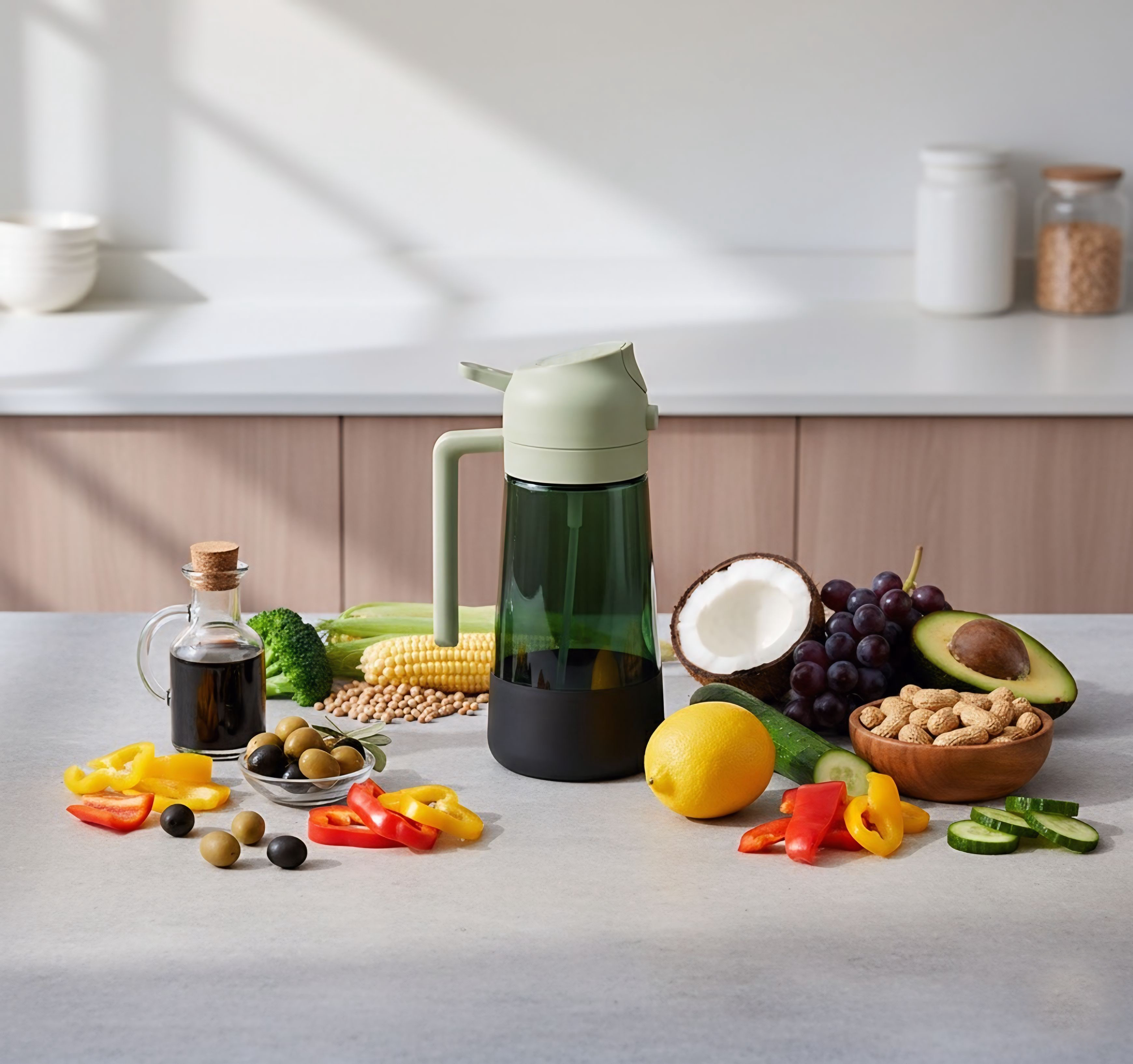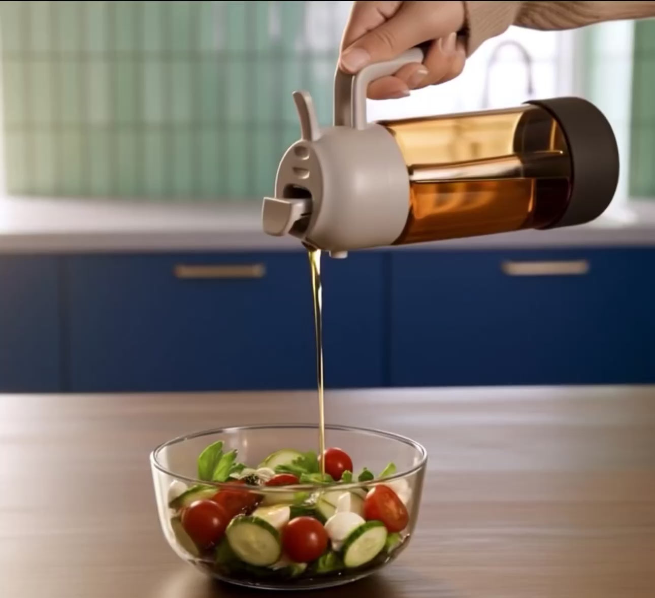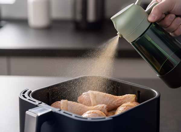 Apasa butonul situat pe capacul produsului iar acesta va turna uleiul pe elementele dorite.